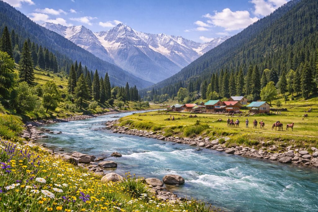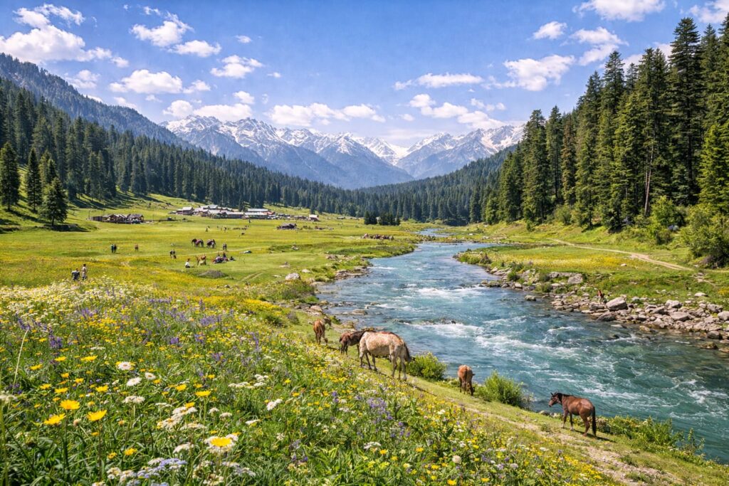 Pahalgam is a peaceful hill town surrounded by rivers, pine forests, and green meadows. It is ideal for families and couples.